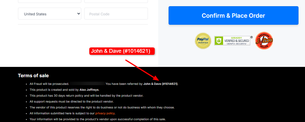To be SURE that we get credited for your purchase, so that you can be SURE to get your BONUS, then the affiliate ID on the order page must be 'John & Dave (#1014621)', as shown in the image below.