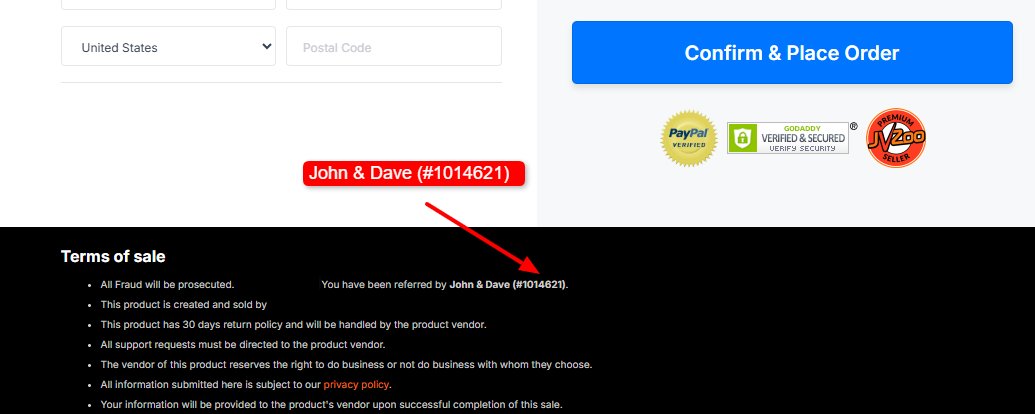 To be SURE that we get credited for your purchase, so that you can be SURE to get your BONUS, then the affiliate ID on the order page must be 'John & Dave (#1014621)', as shown in the image below.