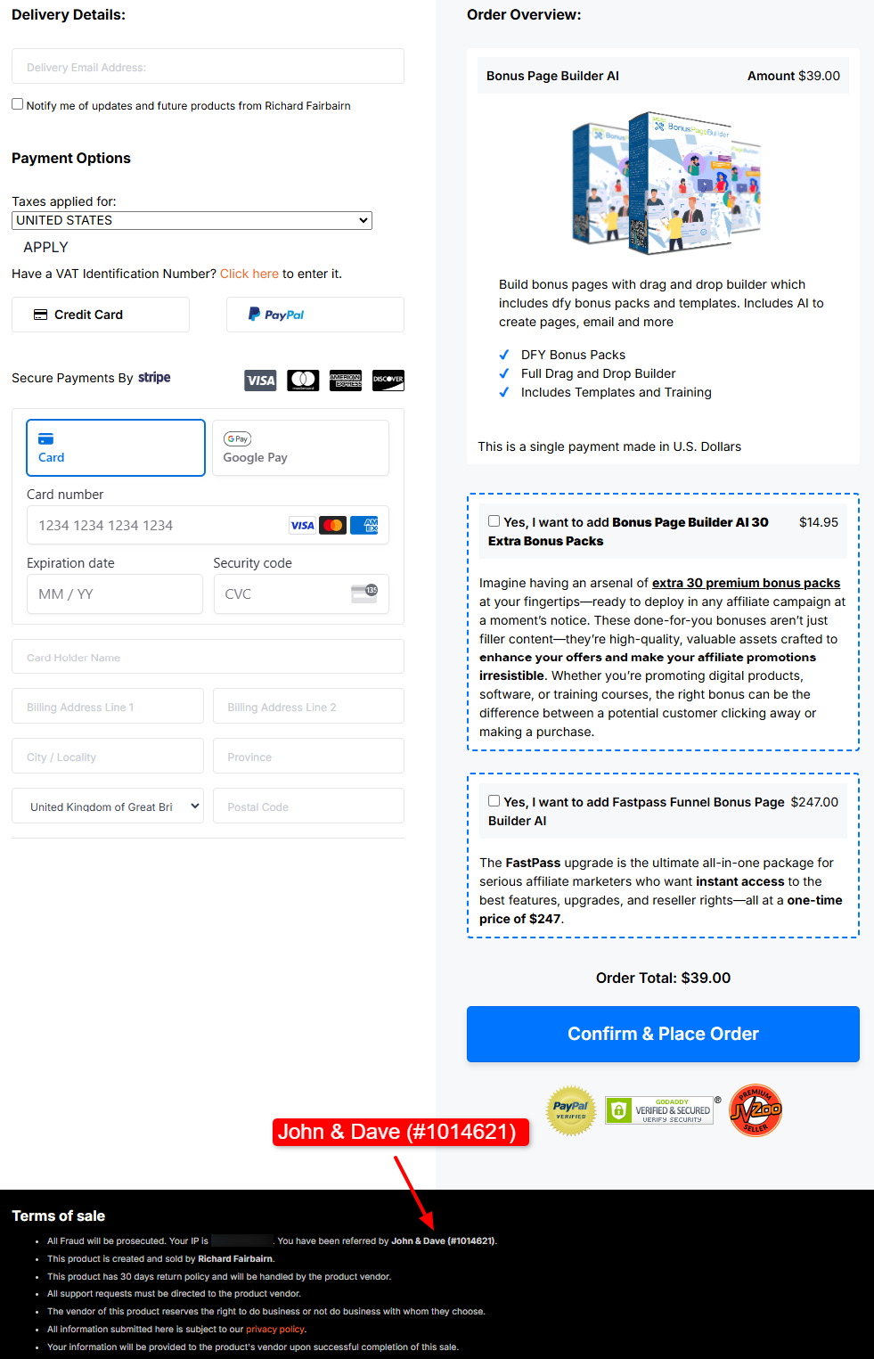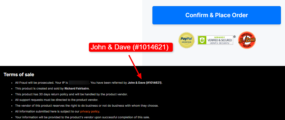 To be SURE that we get credited for your purchase, so that you can be SURE to get your BONUS, then the affiliate ID on the order page must be 'John & Dave (#1014621)', as shown in the image below.