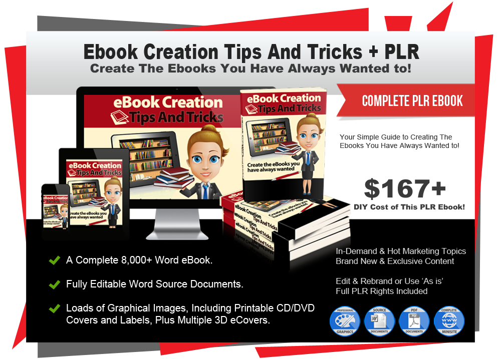 In this PLR package titled 'Ebook Creation Tips and Tricks' you will receive PLR rights to a complete 8,000 word eBook and all the eCover graphics you could possibly need to make this a success. It also makes a great list building bonus offering for any of your niche products!