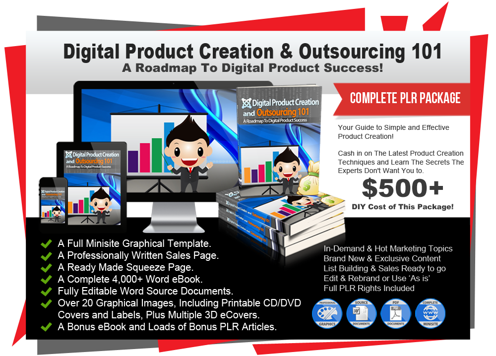 In this PLR package titled 'Digital Product Creation & Outsourcing 101' you will receive PLR rights to a complete 4,000 word eBook, a professionally written ready made Sales Page, a custom Squeeze Page and all the eCover graphics you could possibly need to make this a success. It also makes a great list building bonus offering for any of your niche products!