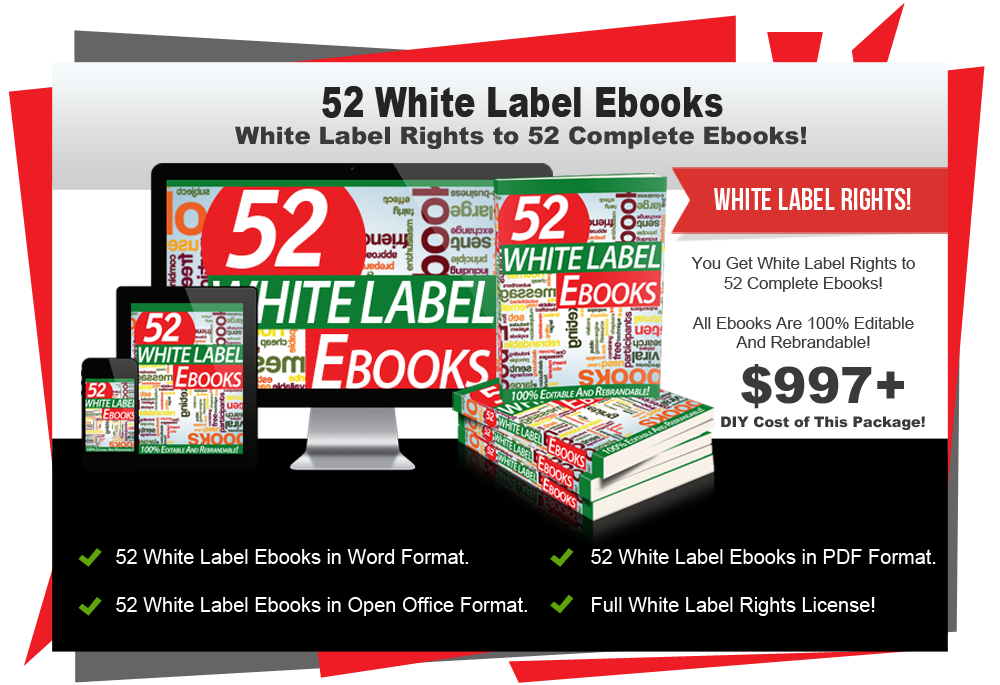 This is an AWESOME collection of WHITE LABEL Ebooks, you get 52 White Label Ebooks in Word Format, 52 White Label Ebooks in Open Office Format and 52 White Label Ebooks in PDF Format. Remember, you get a Full White Label Rights License for all these Ebooks!