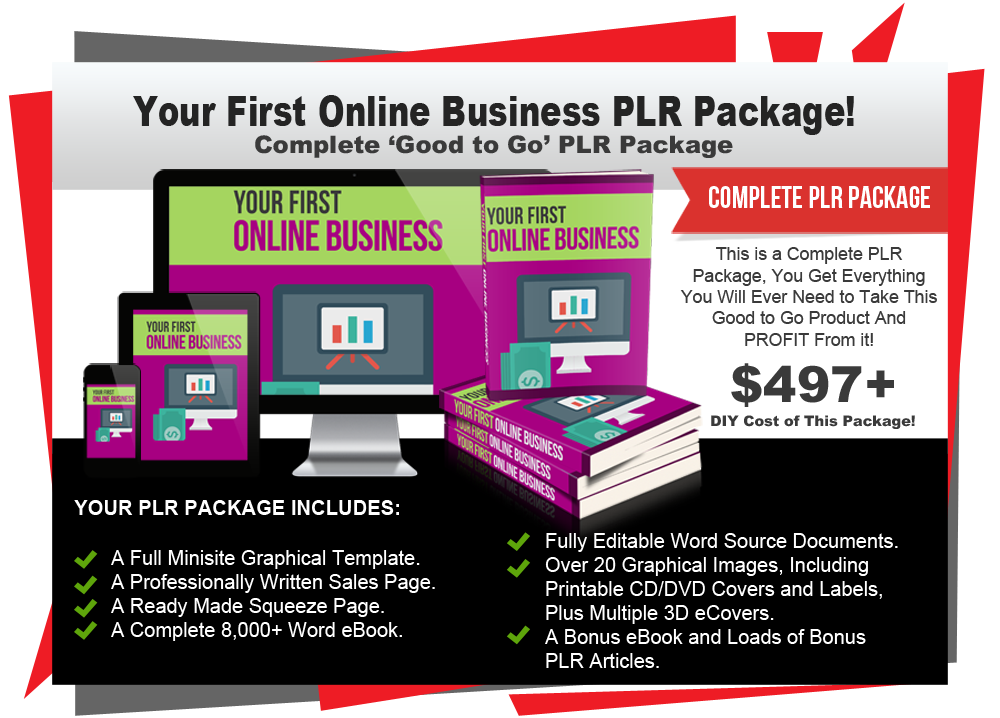 In this PLR package titled 'Your First Online Business' you will receive PLR rights to a complete 8,000 word eBook, a professionally written ready made Sales Page, a custom Squeeze Page and all the eCover graphics you could possibly need to make this a success. It also makes a great list building bonus offering for any of your niche products!