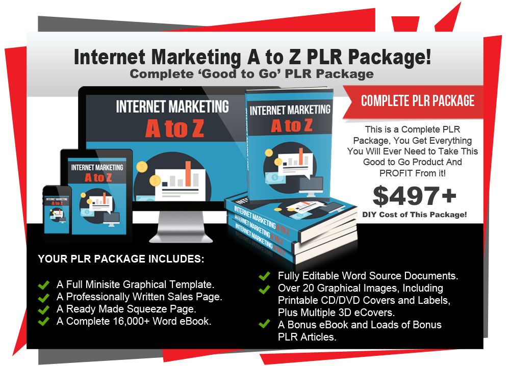In this PLR package titled 'Internet Marketing A to Z' you will receive PLR rights to a complete 16,000 word eBook, a professionally written ready made Sales Page, a custom Squeeze Page and all the eCover graphics you could possibly need to make this a success. It also makes a great list building bonus offering for any of your niche products!