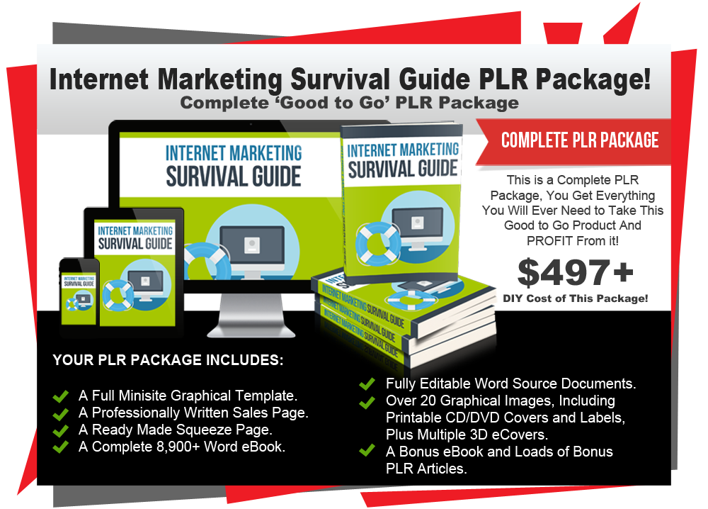 In this PLR package titled 'Internet Marketing Survival Guide' you will receive PLR rights to a complete 8,900 word eBook, a professionally written ready made Sales Page, a custom Squeeze Page and all the eCover graphics you could possibly need to make this a success. It also makes a great list building bonus offering for any of your niche products!