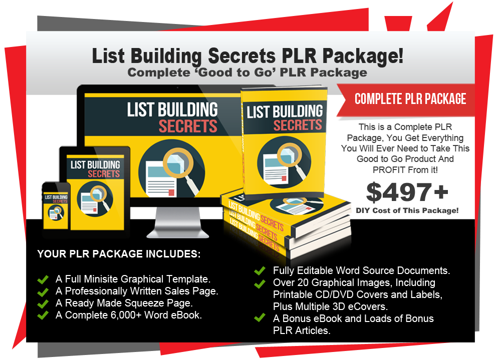 In this PLR package titled 'List Building Secrets' you will receive PLR rights to a complete 6,000 word eBook, a professionally written ready made Sales Page, a custom Squeeze Page and all the eCover graphics you could possibly need to make this a success. It also makes a great list building bonus offering for any of your niche products!