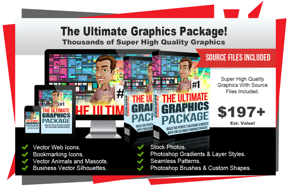 Build the perfect sales page & website with The Ultimate Graphics Package! This AMAZING Package includes Vector web icons, bookmarking icons, vector animals and mascots, business vector silhouettes, vector flowers, stock photos, Photoshop gradients, indented layer styles, seamless pixel patterns, Photoshop brushes, Photoshop custom shapes, hi-res seamless Photoshop patterns, high-res stock textures, and web graphics.