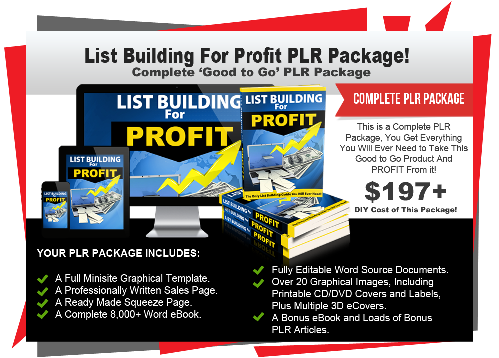In this PLR package titled 'List Building For Profit' you will receive PLR rights to a complete 8,000 word eBook, a professionally written ready made Sales Page, a custom Squeeze Page and all the eCover graphics you could possibly need to make this a success. It also makes a great list building bonus offering for any of your niche products!