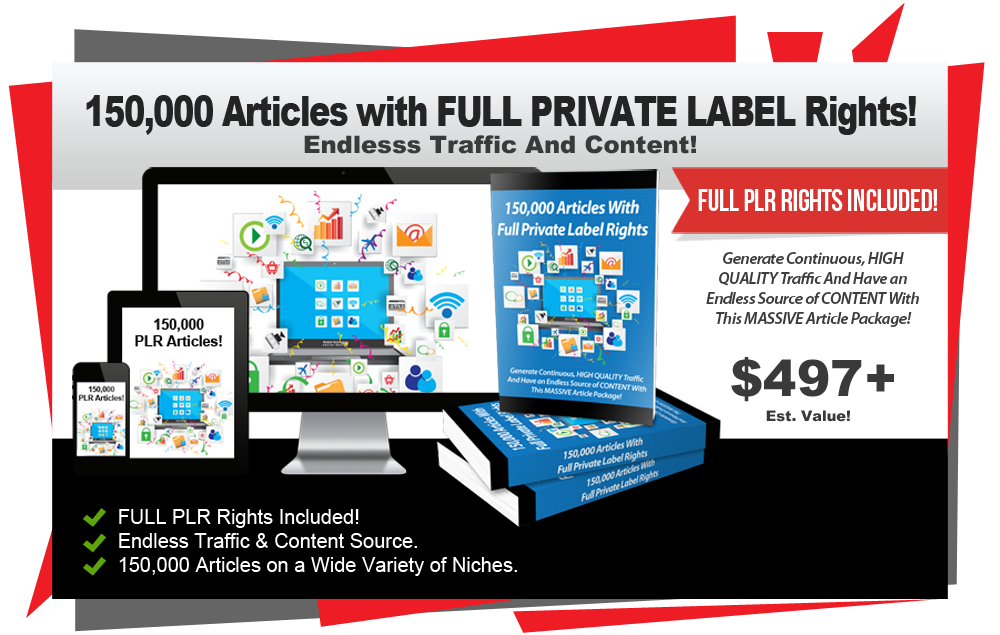 With this MASSIVE 150,000 PLR Article Package you'll never need to worry about content for your sites again.