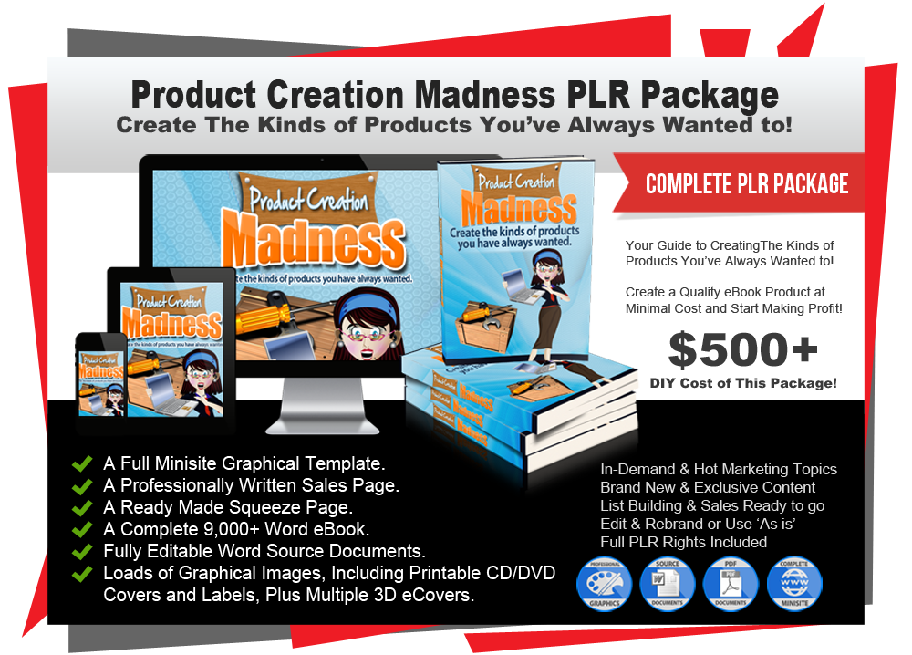 In this PLR package titled 'Product Creation Madness' you will receive PLR rights to a complete 9,000 word eBook, a professionally written ready made Sales Page, a custom Squeeze Page and all the eCover graphics you could possibly need to make this a success. It also makes a great list building bonus offering for any of your niche products!