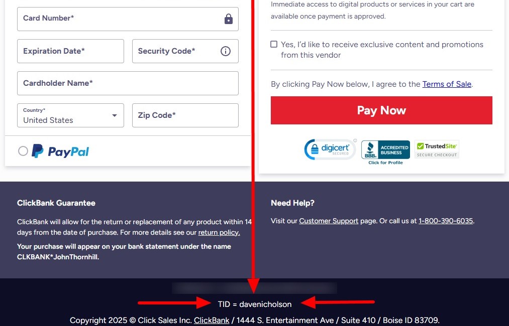 After You Click The 'Order Now' Button You Should See: TID =davenicholson at The Very Bottom of The Order Page, as Shown in THIS IMAGE